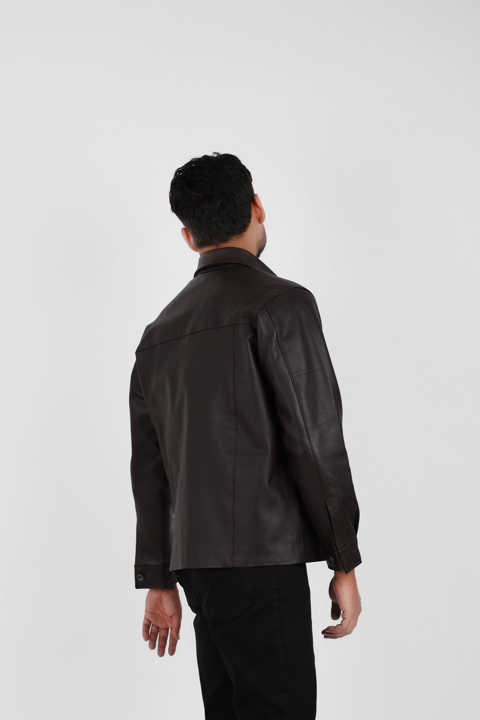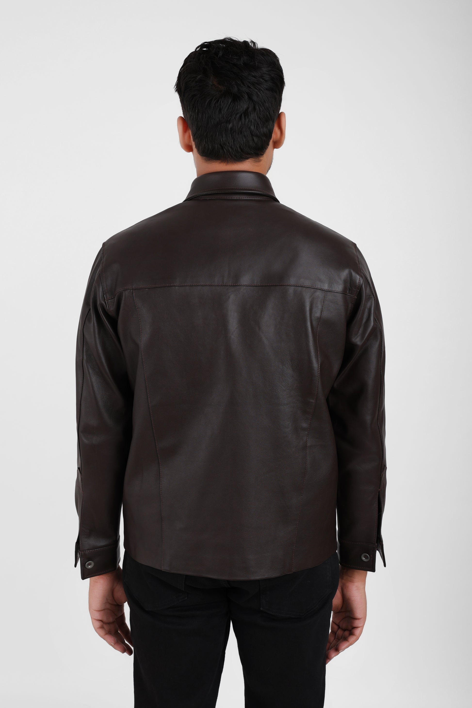 Crafted from 100% full-grain leather, this chocolate brown shacket offers a sophisticated take on the classic shirt-jacket hybrid. The spread collar and button closure provide a clean, structured look, while the polyester lining ensures comfort and ease of movement.